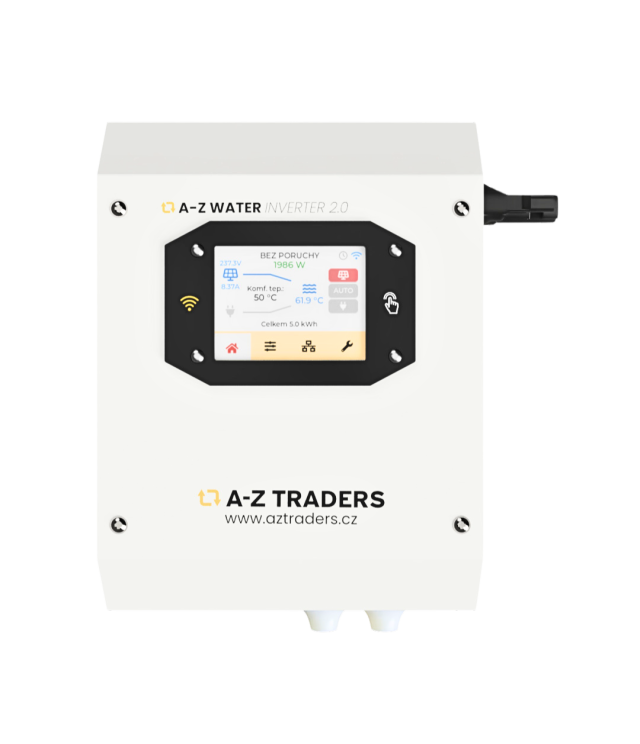 Jednotka A-Z WATER 2.0 nabízí plně barevný grafický dotykový LCD displej, který přehledně v českém jazyce informuje o provozních stavech a parametrech celého systému. Ovládání je maximálně přehledné a jednoduché díky využití grafických prvků, které intuitivně představují jednotlivé funkce. Mimo grafického ovládání a zobrazení režimu funkce je k dispozici také přesné měření parametrů FVE včetně hodnoty celkového výkonu dodaného z FV panelů do akumulační nádrže.