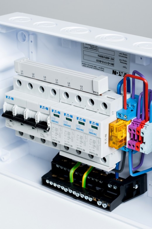V rozváděči je osazen svodič přepětí AC T1+T2,jistič B20/3 pro jištění vstupu do střídače. Dále Jistič B2/1 který jistí PATICI/RELE Finder, které zajišťuje N0% pro splnění podmínek distribucí (součástí je jak NC, tak NO kontakt a střed.) Čímž je zajištěno použití pro všechny typy měničů na trhu.