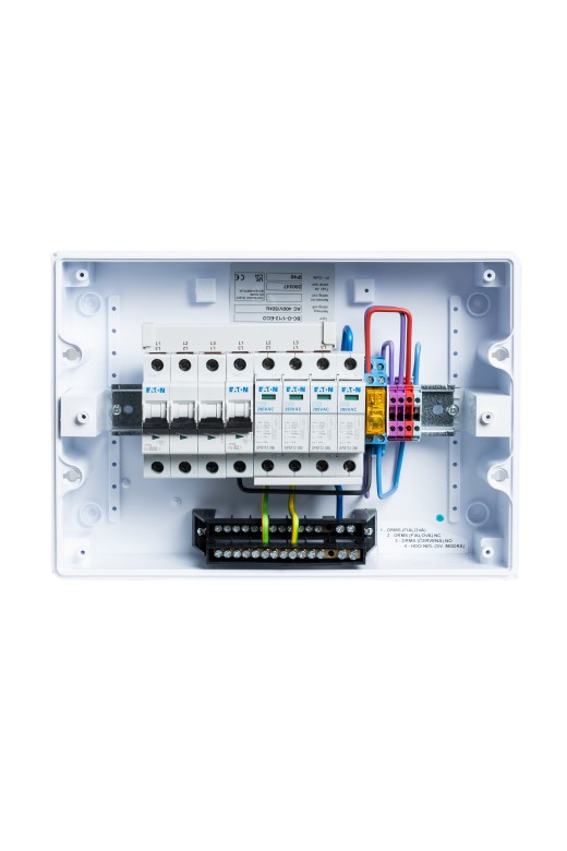 AC rozváděč určený pro montáž na zeď, IP40/20C sloužící jako vstupní rozváděč (u střídače) pro třífázové fotovoltaické elektrárny (typicky střídače: GOODWE, SOLAX, GROWATT, WATTSONIC a jiné).