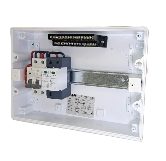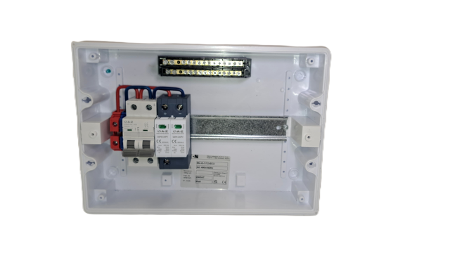 DC rozváděč určený pro montáž na zeď, IP40/20 sloužící jako vstupní rozváděč od fotovoltaických panelů (zejména k A-Z WATER INVERTERU nebo střídači) při použití technologie pro ohřev vody, nebo FVE řetězců do 500 V.
